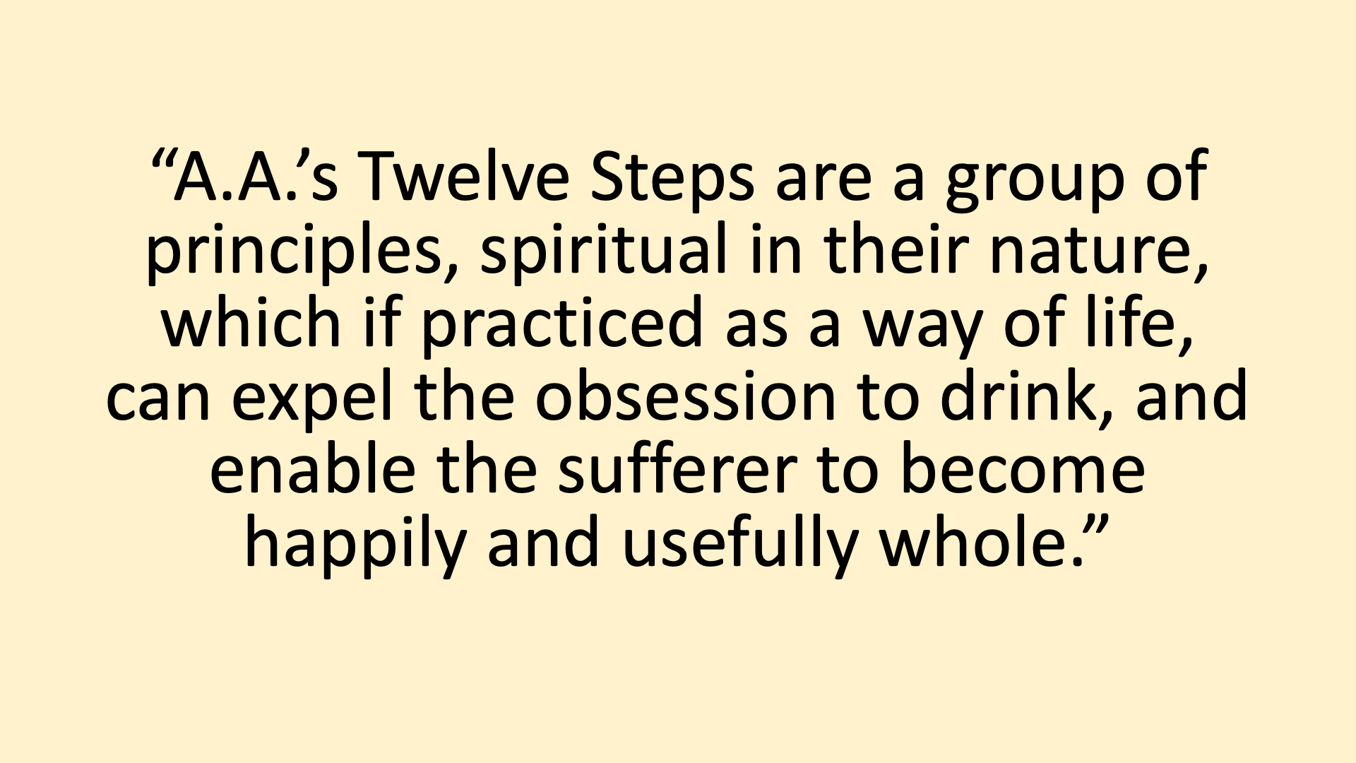 “A.A.’s Twelve Steps are a group of principles, spiritual in their nature, if practiced as a way of life, can expel the obsession to drink, and enable the sufferer to become happily and usefully whole.”